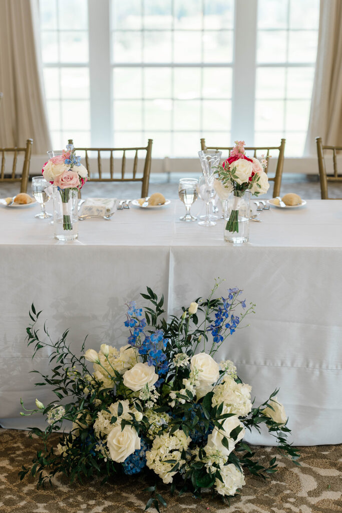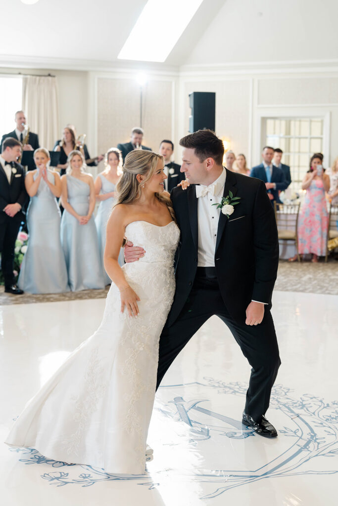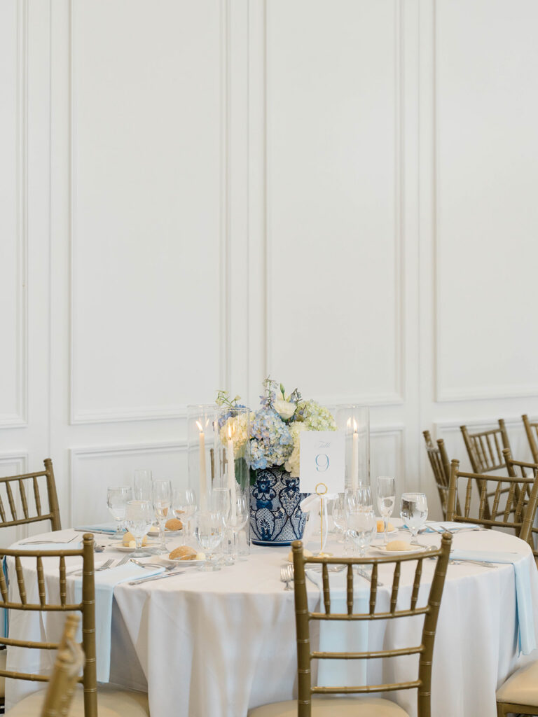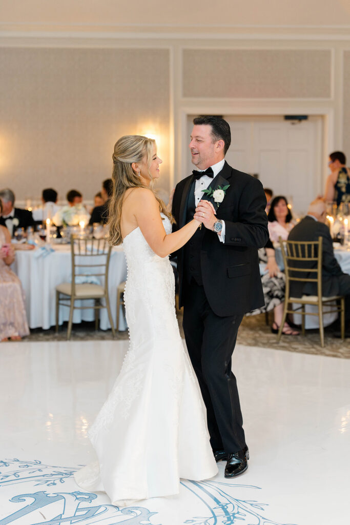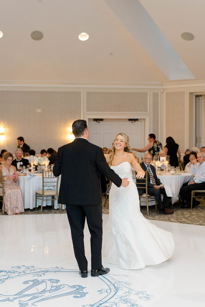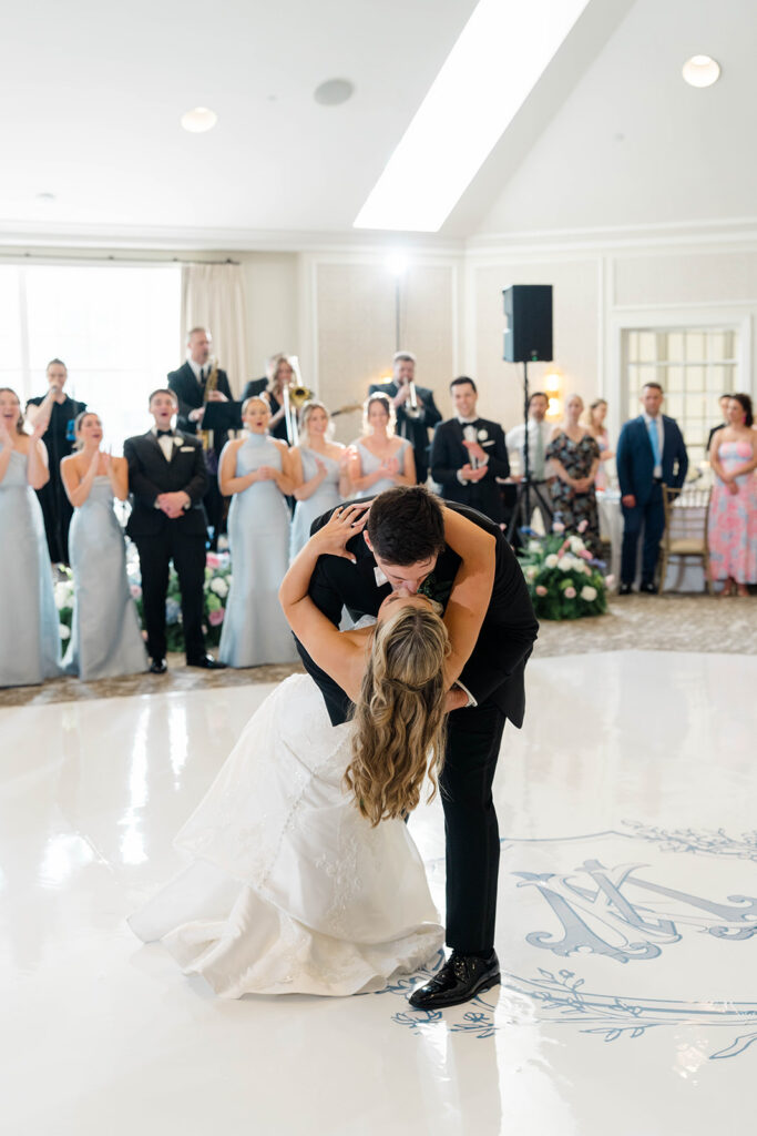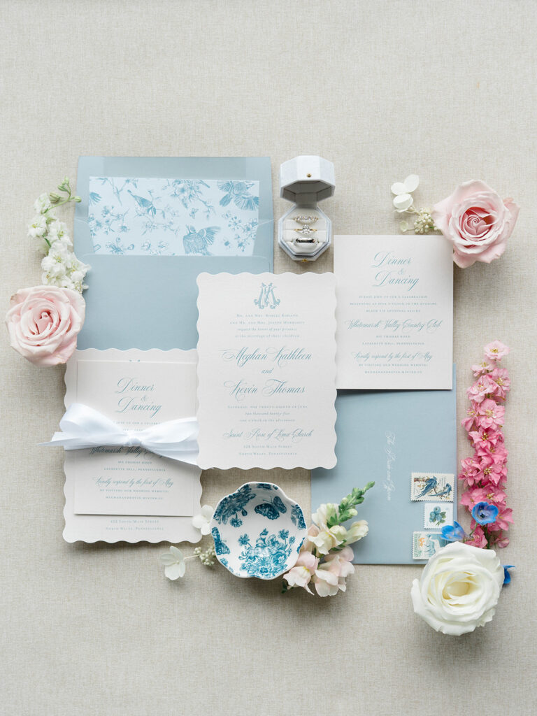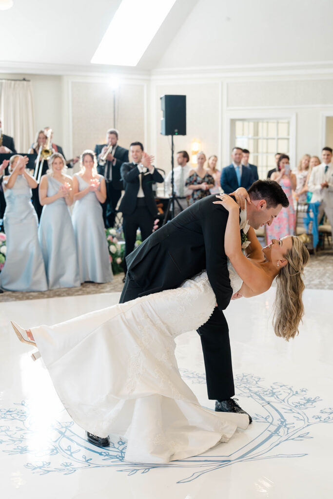 I love when wedding details are cohesive throughout the day, it helps to elevate the overall experience. When couples take the time to ensure all the details flow it really shows. Meghan and Kevin chose blue as their main color for the day. From the elegant blue invitation suite which was enhanced with pops of pink, gorgeous blue patterned vases on the reception tables, and the incredible blue bridesmaids dresses everything was perfectly curated. They also went as far as to add a beautiful blue emblem on the dance floor which helped tie the whole room together.
