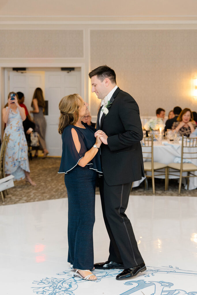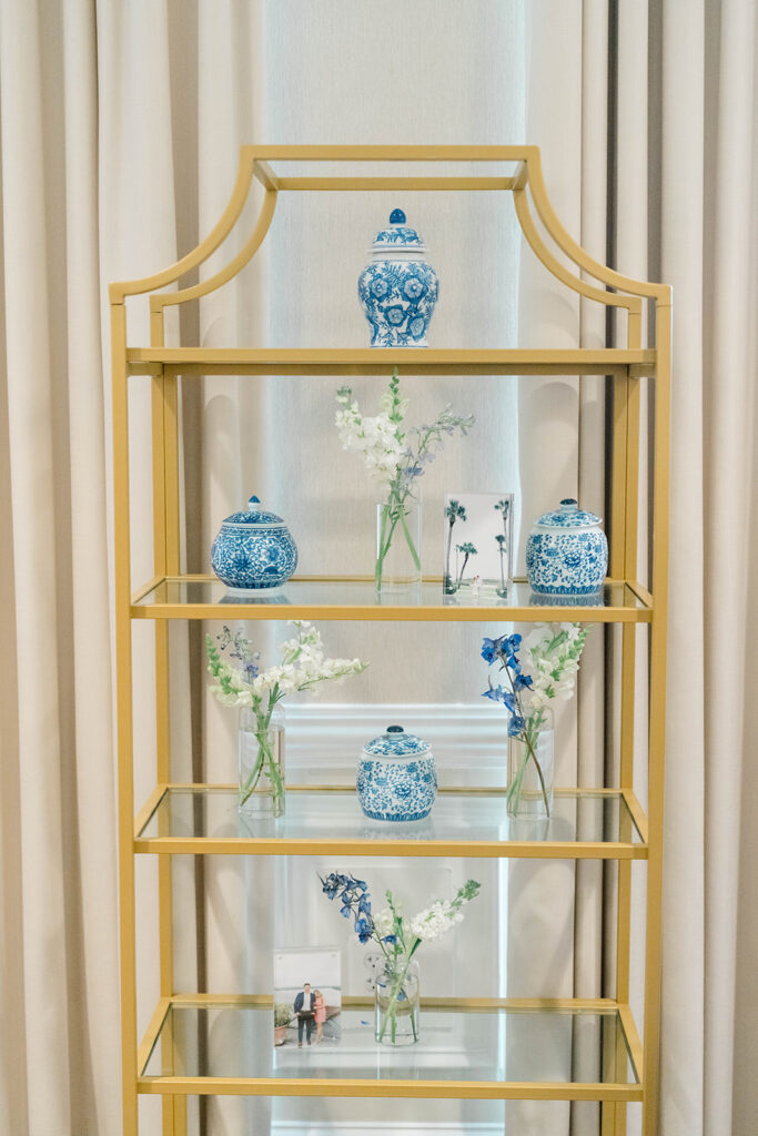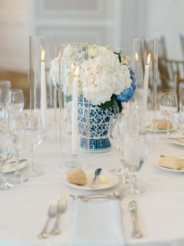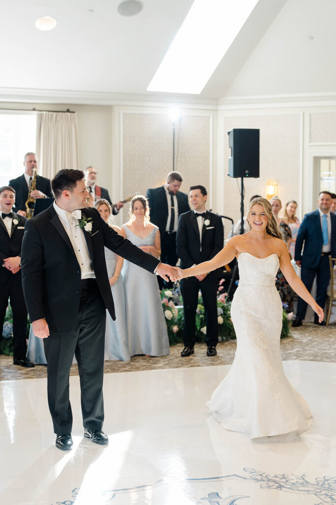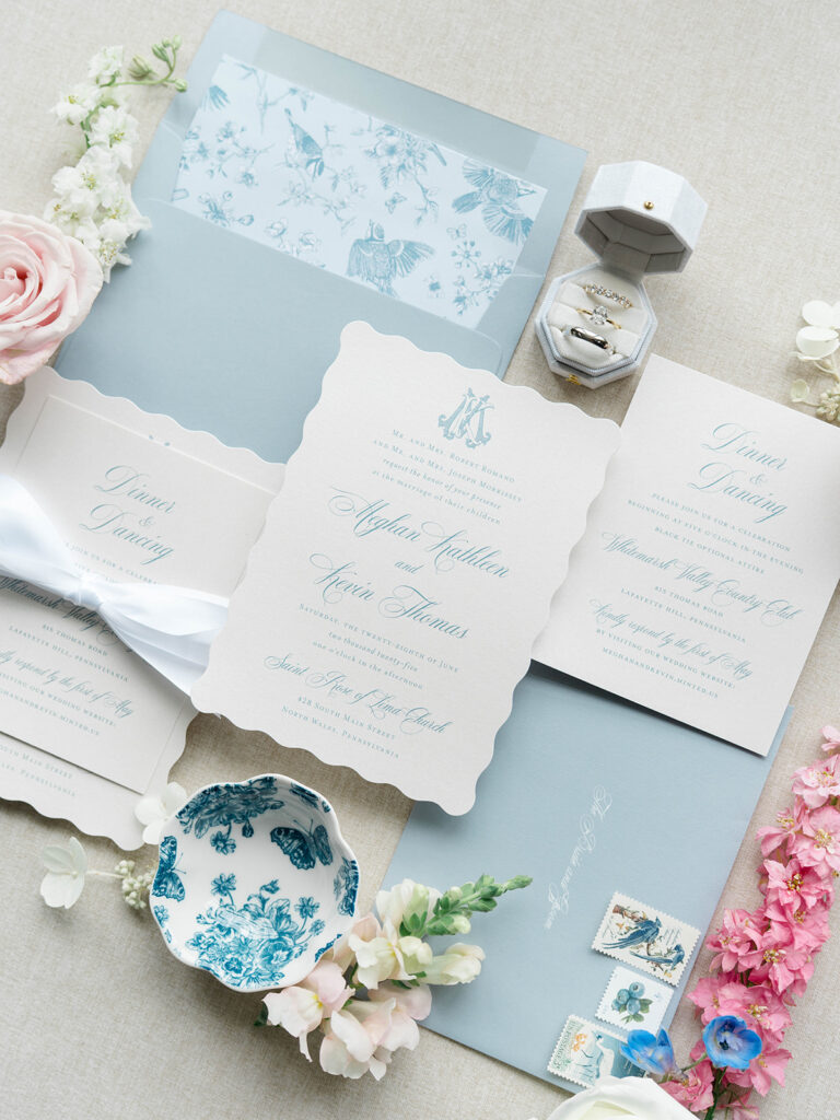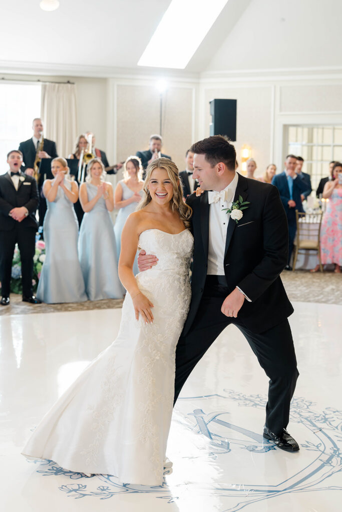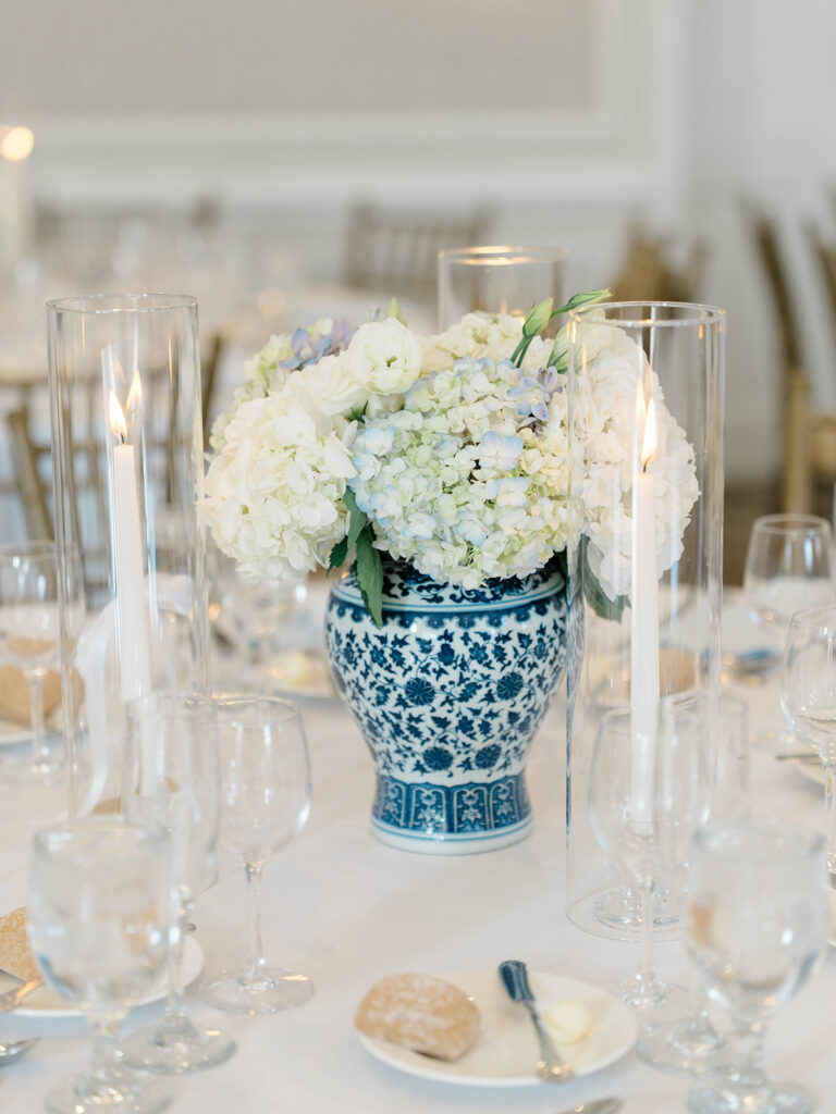 I love when wedding details are cohesive throughout the day, it helps to elevate the overall experience. When couples take the time to ensure all the details flow it really shows. Meghan and Kevin chose blue as their main color for the day. From the elegant blue invitation suite which was enhanced with pops of pink, gorgeous blue patterned vases on the reception tables, and the incredible blue bridesmaids dresses everything was perfectly curated. They also went as far as to add a beautiful blue emblem on the dance floor which helped tie the whole room together.