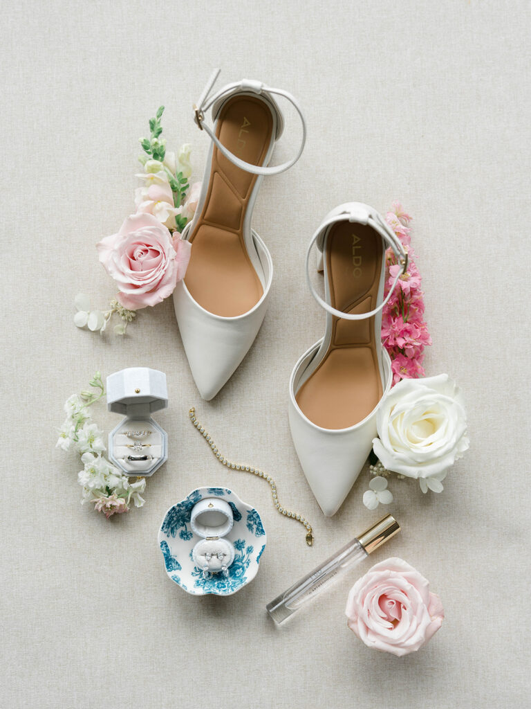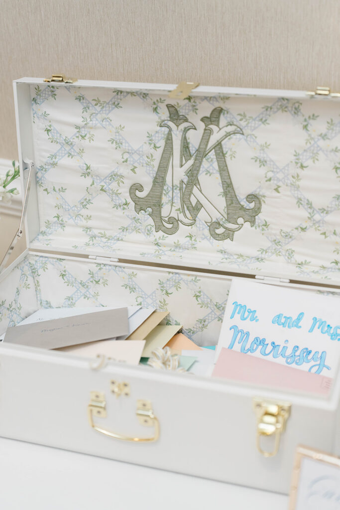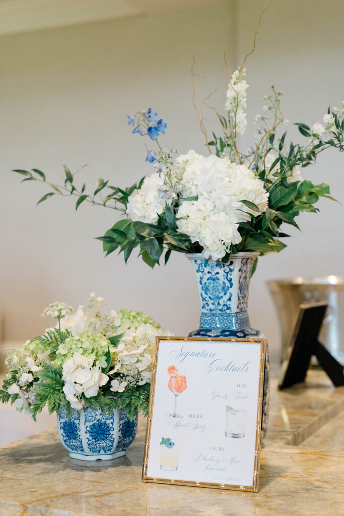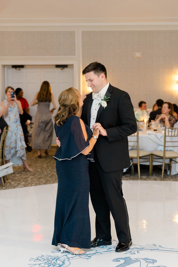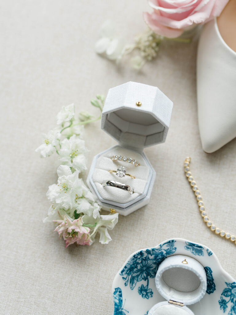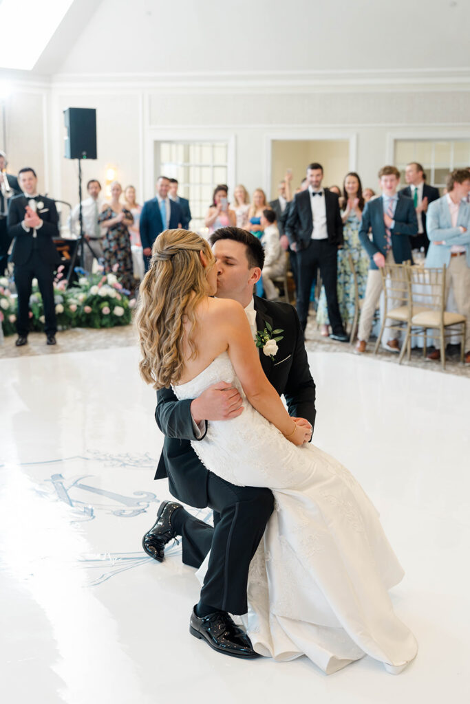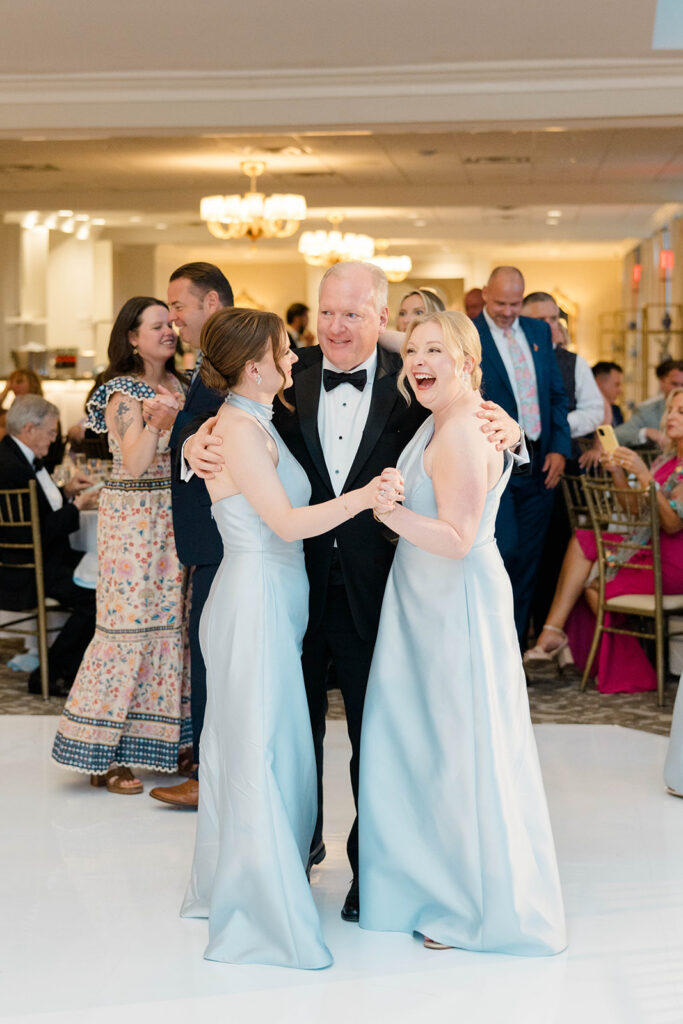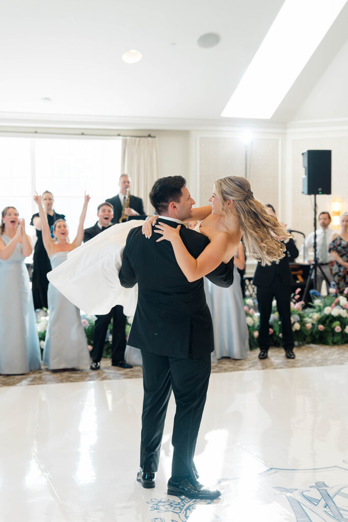 I love when wedding details are cohesive throughout the day, it helps to elevate the overall experience. When couples take the time to ensure all the details flow it really shows. Meghan and Kevin chose blue as their main color for the day. From the elegant blue invitation suite which was enhanced with pops of pink, gorgeous blue patterned vases on the reception tables, and the incredible blue bridesmaids dresses everything was perfectly curated. They also went as far as to add a beautiful blue emblem on the dance floor which helped tie the whole room together.