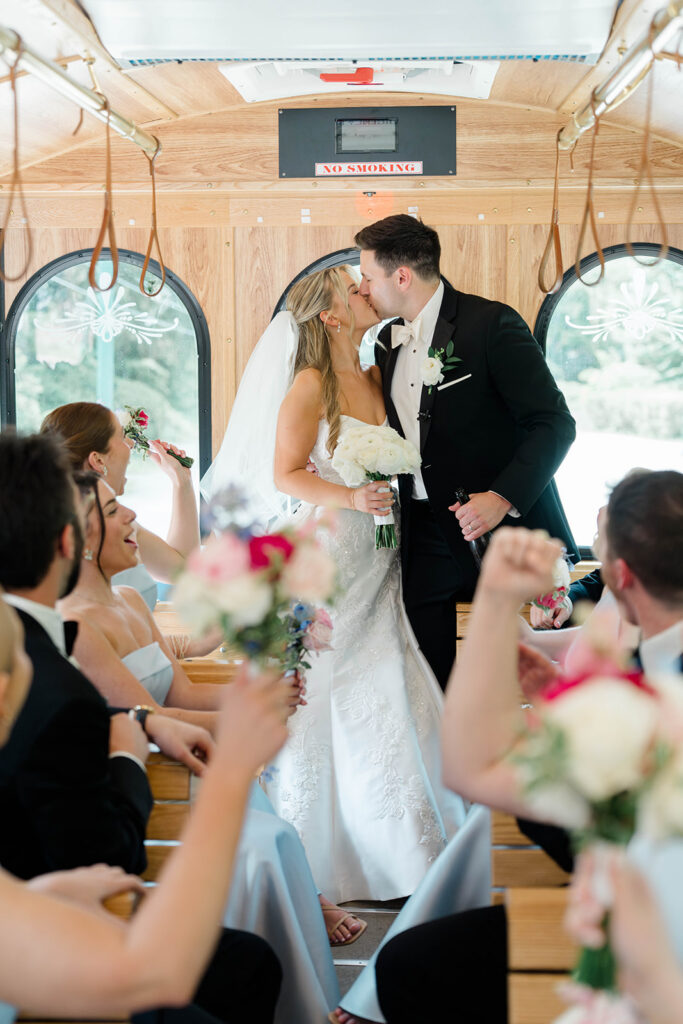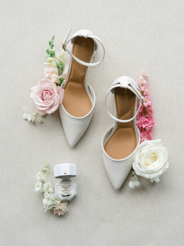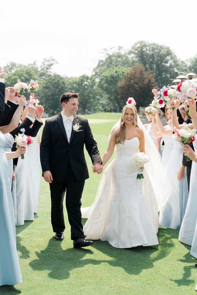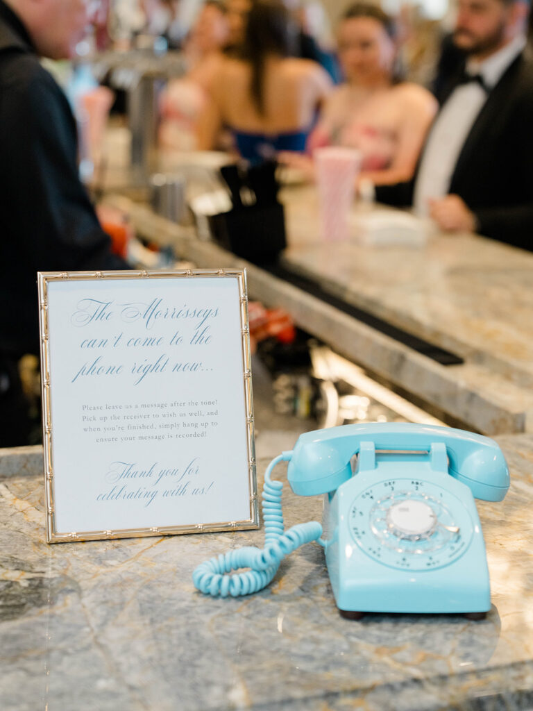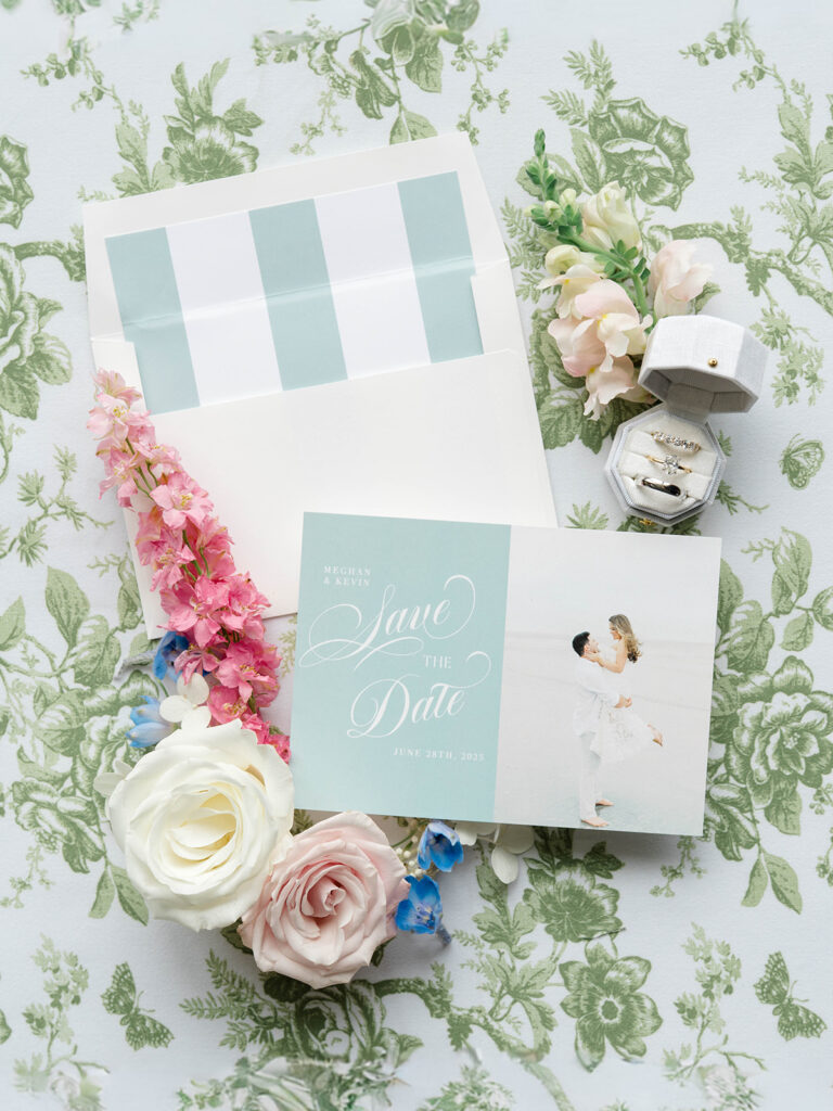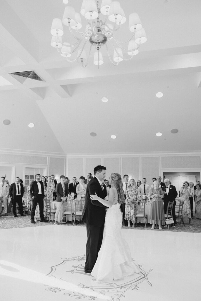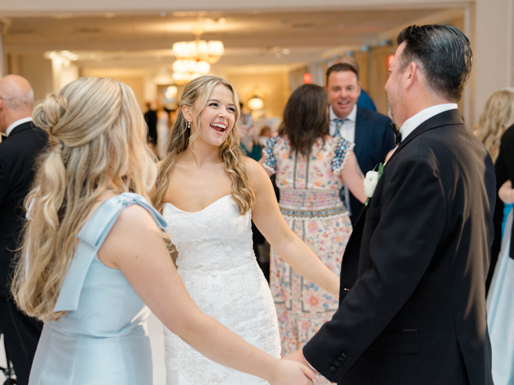 I love when wedding details are cohesive throughout the day, it helps to elevate the overall experience. When couples take the time to ensure all the details flow it really shows. Meghan and Kevin chose blue as their main color for the day. From the elegant blue invitation suite which was enhanced with pops of pink, gorgeous blue patterned vases on the reception tables, and the incredible blue bridesmaids dresses everything was perfectly curated. They also went as far as to add a beautiful blue emblem on the dance floor which helped tie the whole room together.