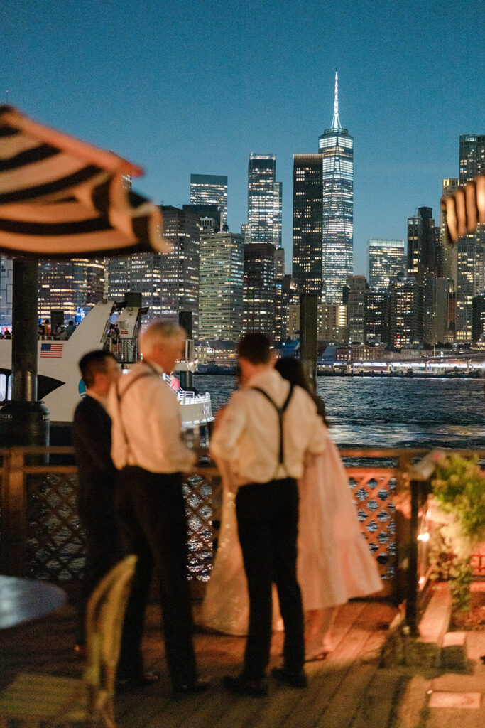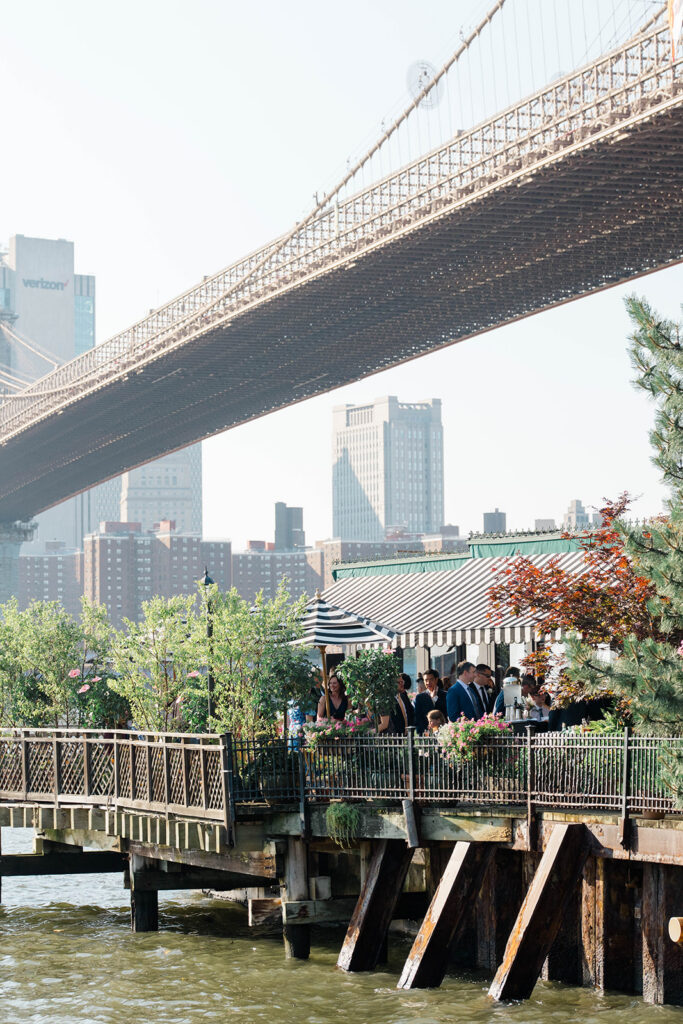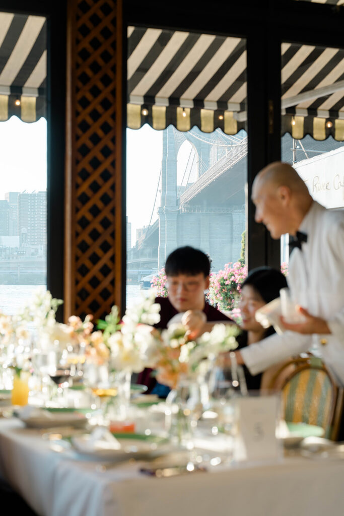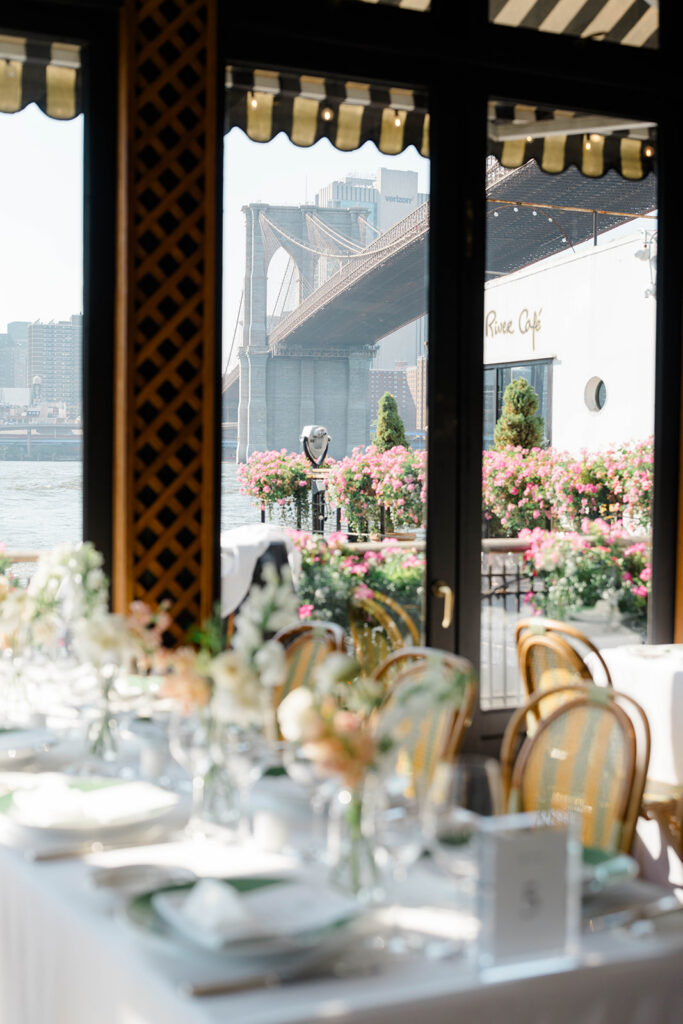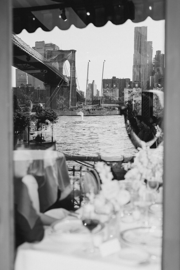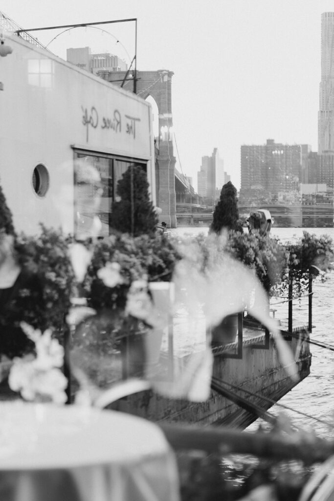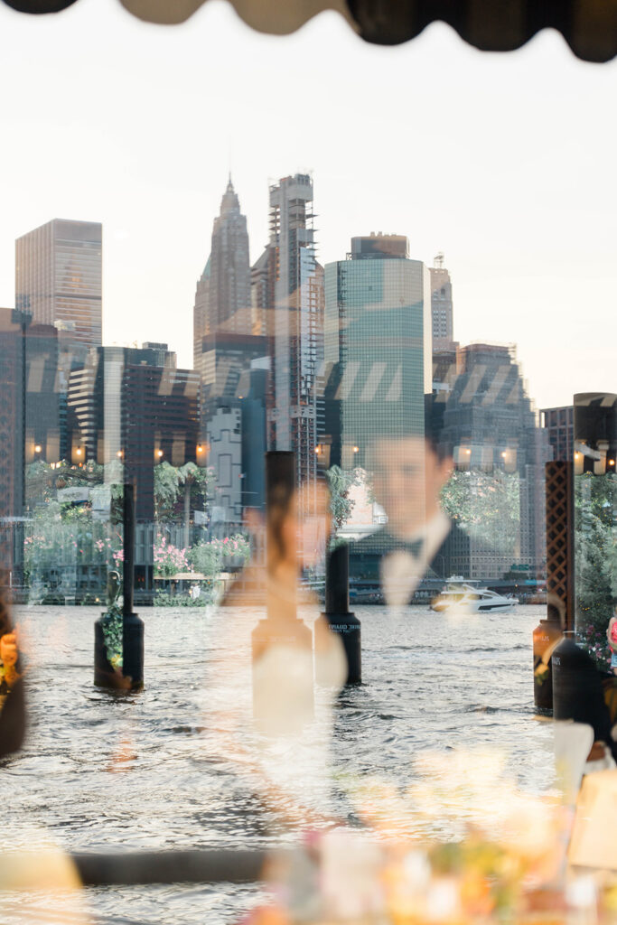 From the moment I saw The River Cafe I knew I was going to be obsessed. Tucked right along the water under the Brooklyn Bridge, it’s one of those venues that instantly feels magical. Cocktail hour on the deck was such a dream with guests sipping drinks while overlooking the skyline and the river below. Inside, the reception space is wrapped in glass, so everywhere you turn there’s a new stunning view of the city. I loved getting to capture the reflections of the skyscrapers in the windows as well as Crystal and Cooper happily chatting with their guests. It was so artistic and different from a typical wedding day.