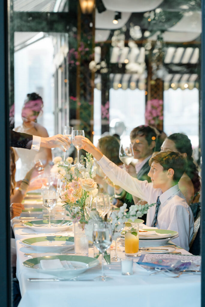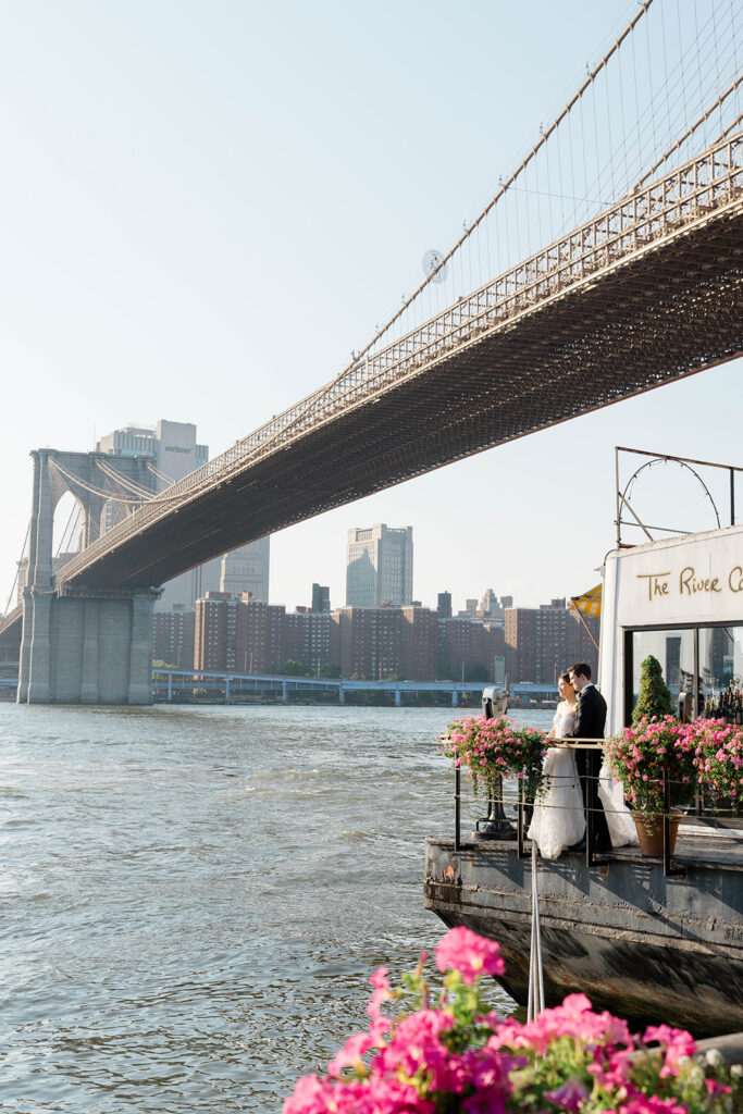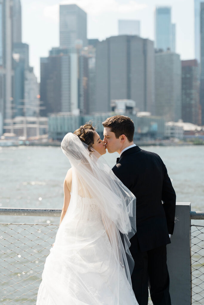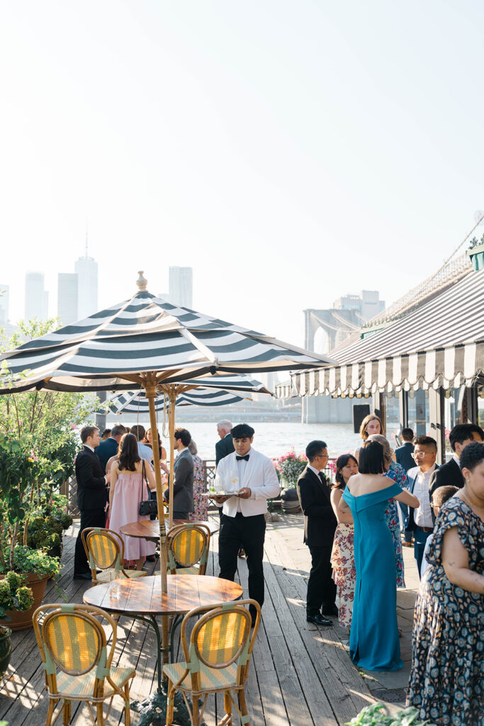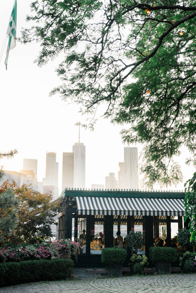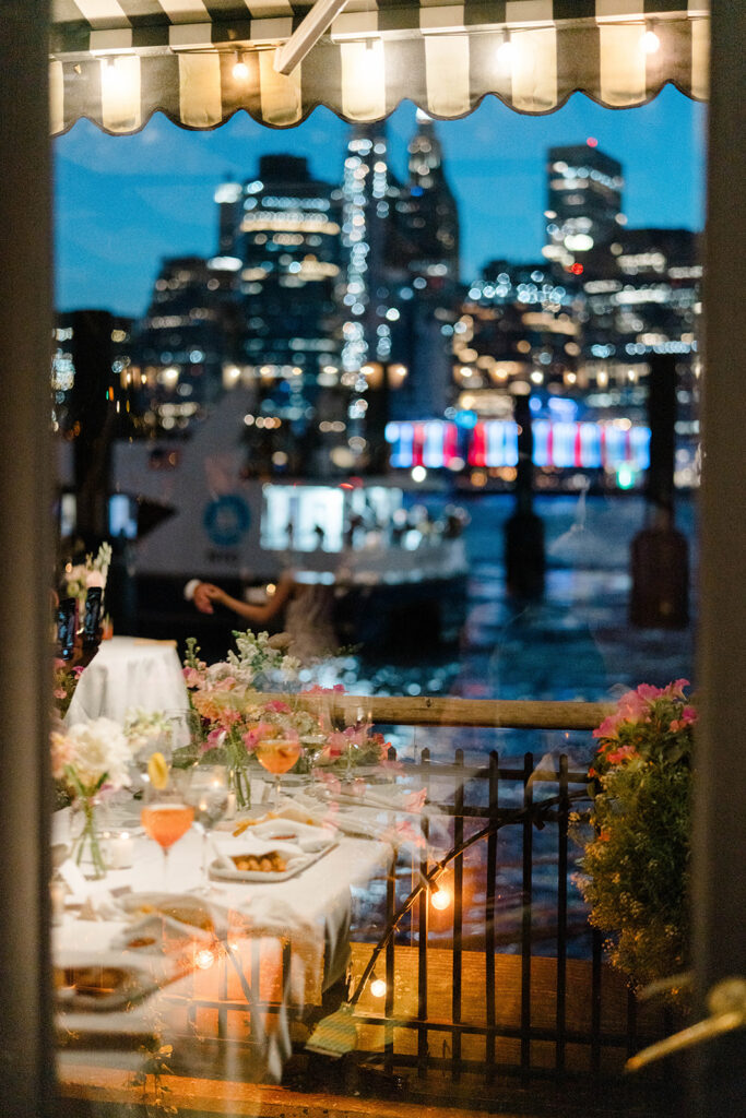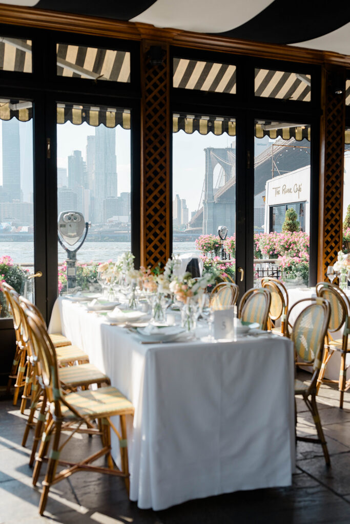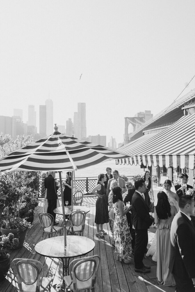 From the moment I saw The River Cafe I knew I was going to be obsessed. Tucked right along the water under the Brooklyn Bridge, it’s one of those venues that instantly feels magical. Cocktail hour on the deck was such a dream with guests sipping drinks while overlooking the skyline and the river below. Inside, the reception space is wrapped in glass, so everywhere you turn there’s a new stunning view of the city. I loved getting to capture the reflections of the skyscrapers in the windows as well as Crystal and Cooper happily chatting with their guests. It was so artistic and different from a typical wedding day.