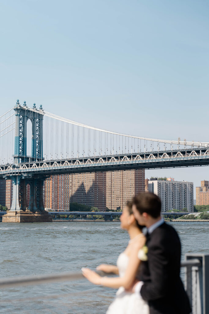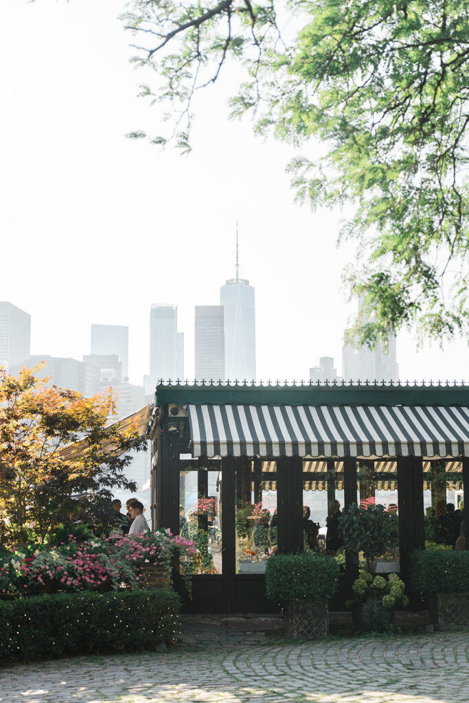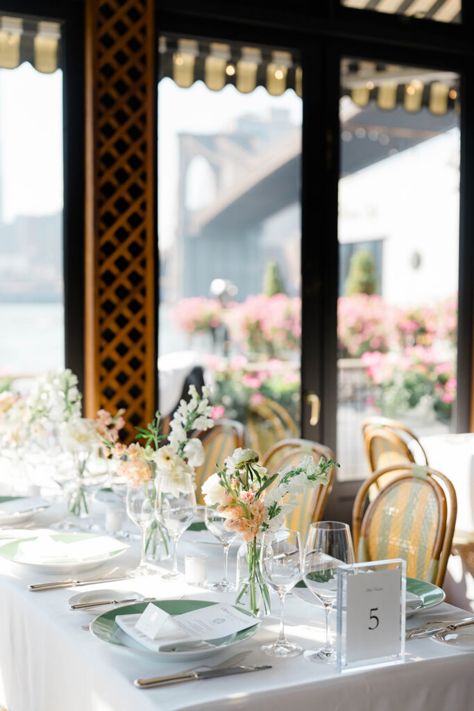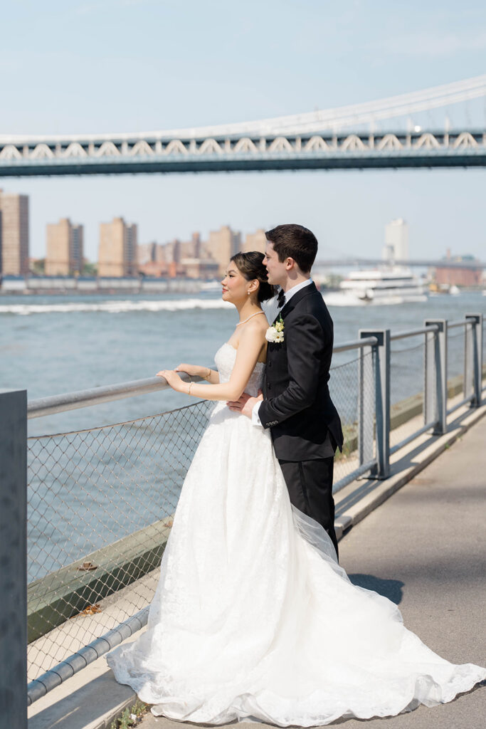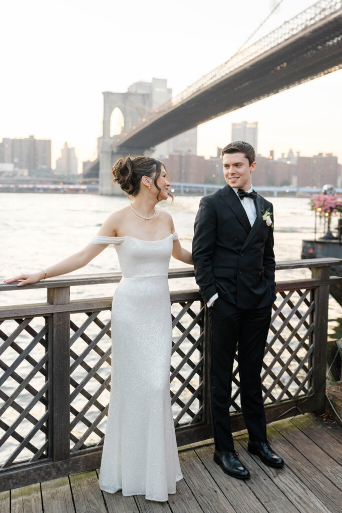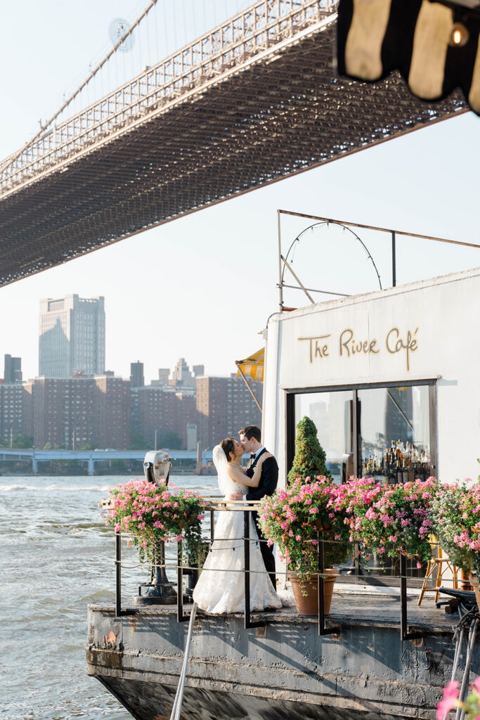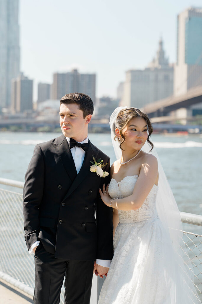 From the moment I saw The River Cafe I knew I was going to be obsessed. Tucked right along the water under the Brooklyn Bridge, it’s one of those venues that instantly feels magical. Cocktail hour on the deck was such a dream with guests sipping drinks while overlooking the skyline and the river below. Inside, the reception space is wrapped in glass, so everywhere you turn there’s a new stunning view of the city. I loved getting to capture the reflections of the skyscrapers in the windows as well as Crystal and Cooper happily chatting with their guests. It was so artistic and different from a typical wedding day.