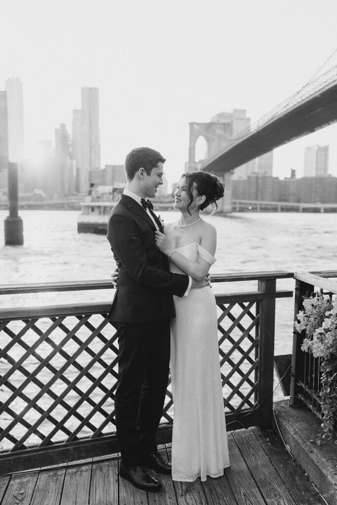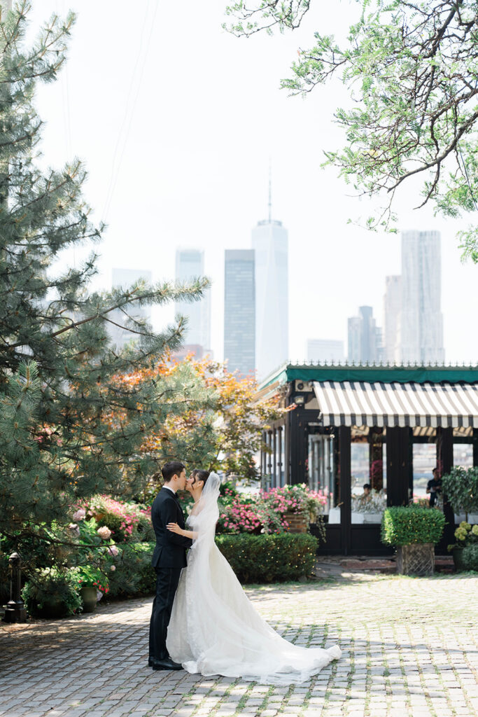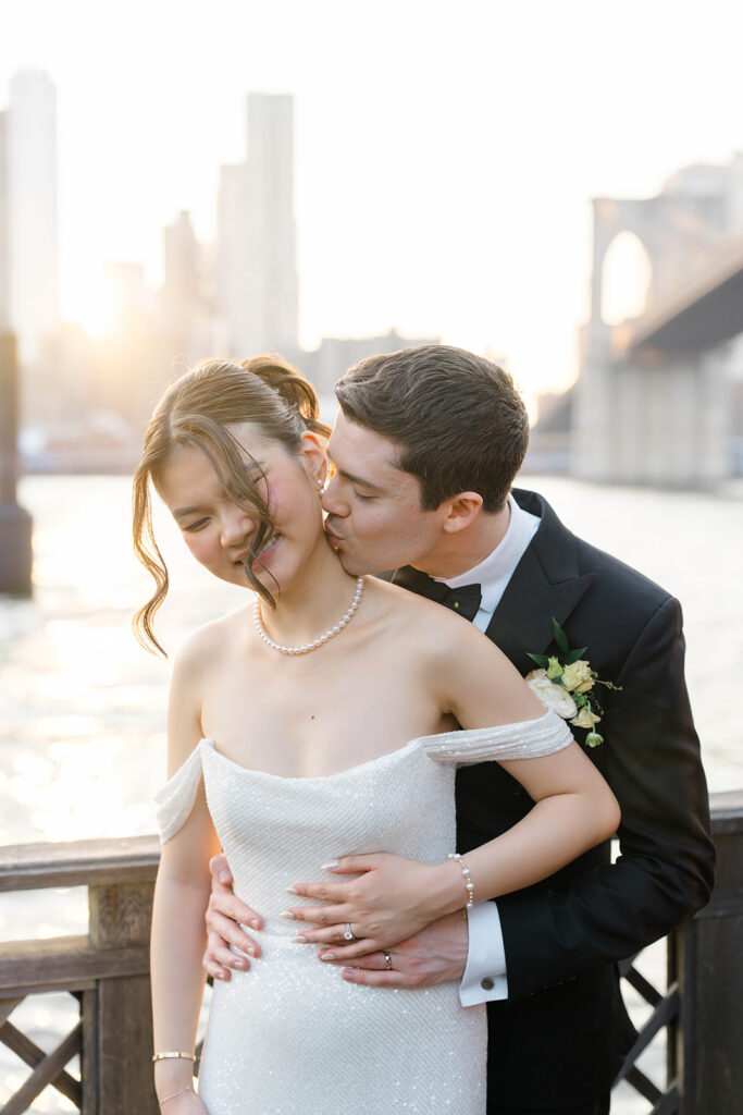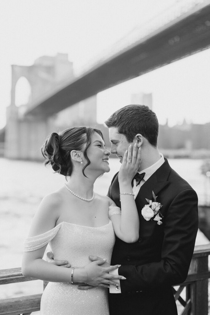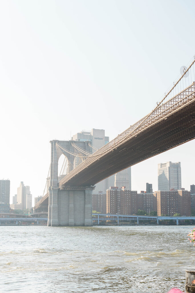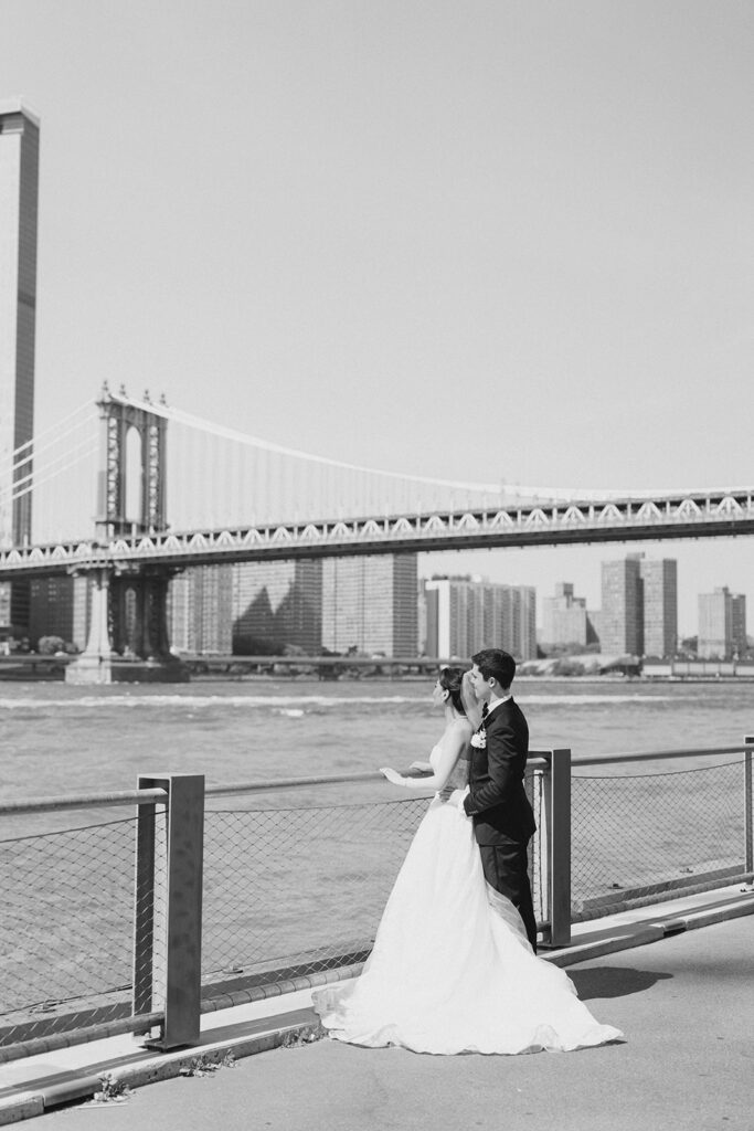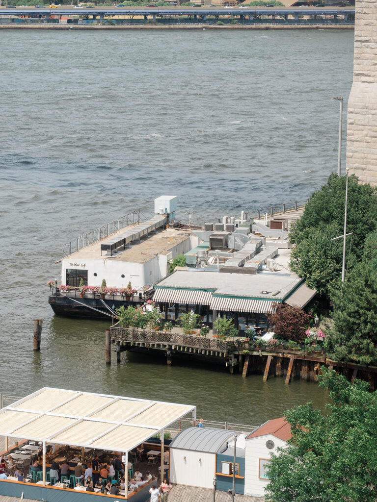 From the moment I saw The River Cafe I knew I was going to be obsessed. Tucked right along the water under the Brooklyn Bridge, it’s one of those venues that instantly feels magical. Cocktail hour on the deck was such a dream with guests sipping drinks while overlooking the skyline and the river below. Inside, the reception space is wrapped in glass, so everywhere you turn there’s a new stunning view of the city. I loved getting to capture the reflections of the skyscrapers in the windows as well as Crystal and Cooper happily chatting with their guests. It was so artistic and different from a typical wedding day.