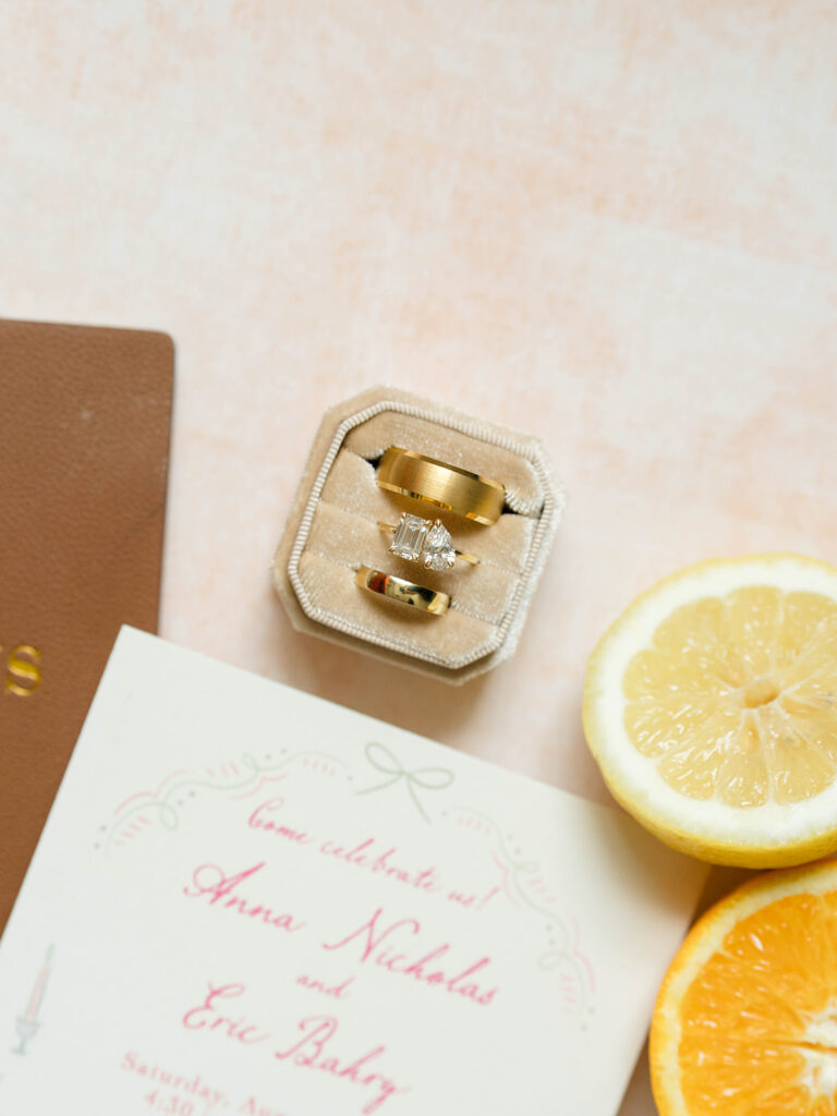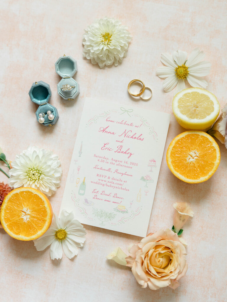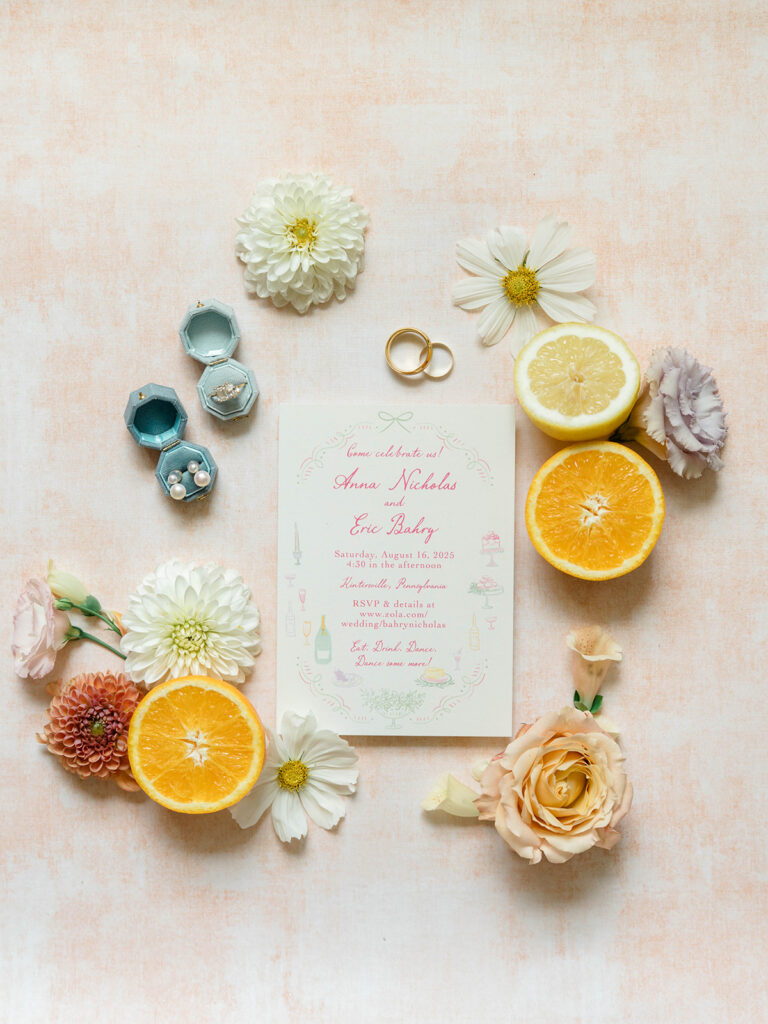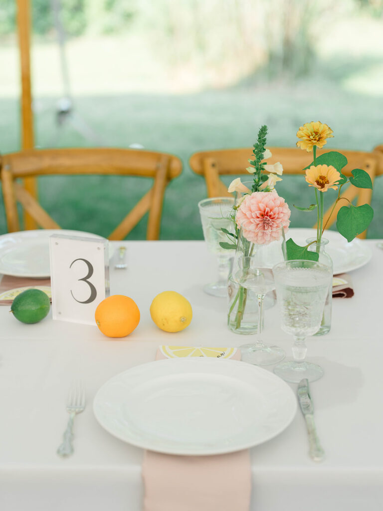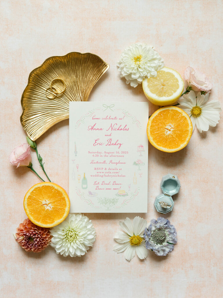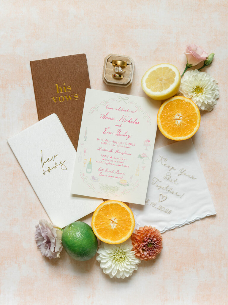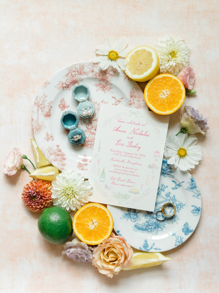 Flatlays are always a time I can use some creative freedom to make sure everything flows perfectly for photos. In this case the invitation sweet was so fun and unique with vibrant colors and fun drawings that it made it easy for them to stand out. I added some citrus fruit to enhance the colors and some patterned plates to give everything some more depth. It was so fun getting to use all of these items, it was almost like putting a puzzle together and the end result was so worth it.