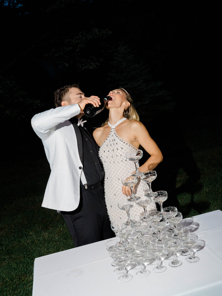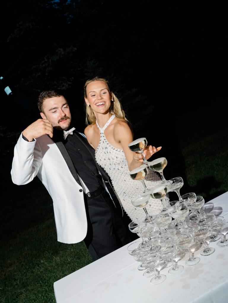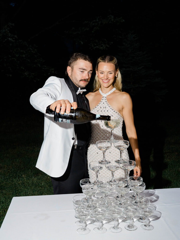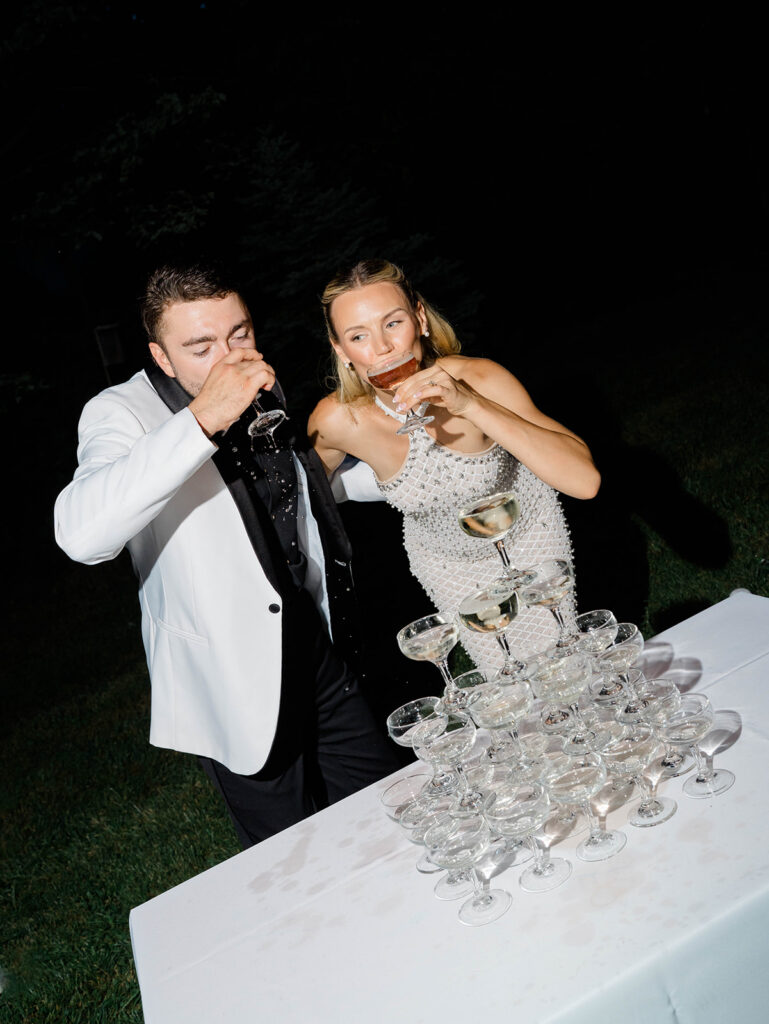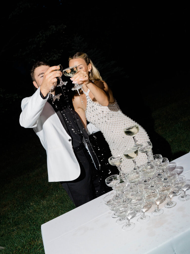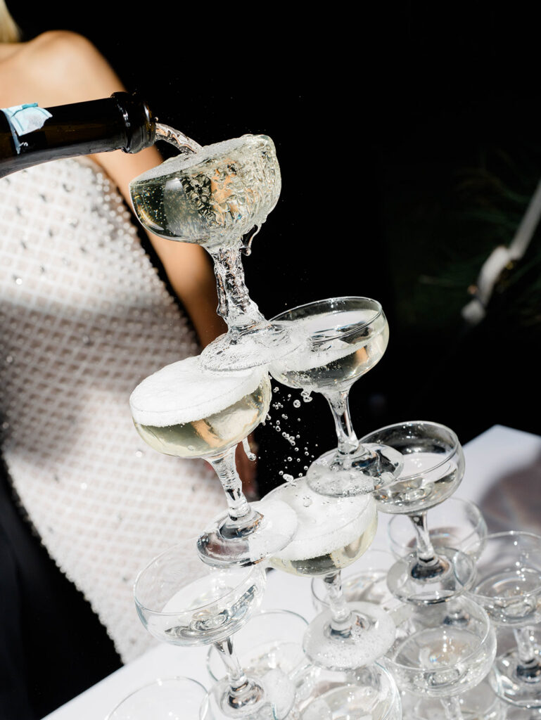 Direct flash during cake cutting and a champagne tower creates the perfect fun and vibrant photos. Using direct flash in these instances can highlight the joy and details in the moment. This technique helps create vibrant, memorable images that truly enhance the excitement.