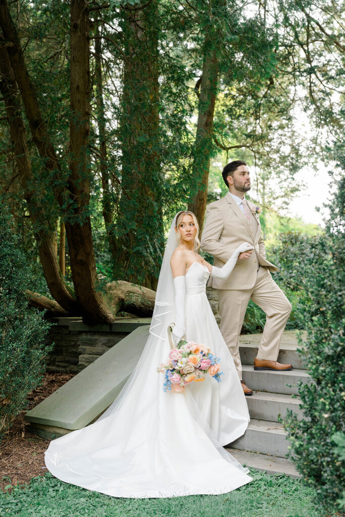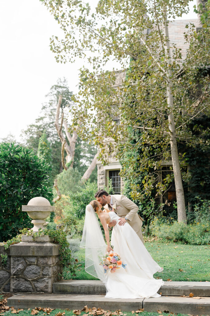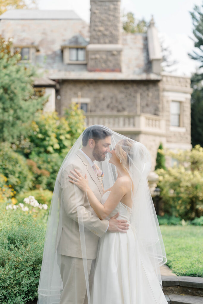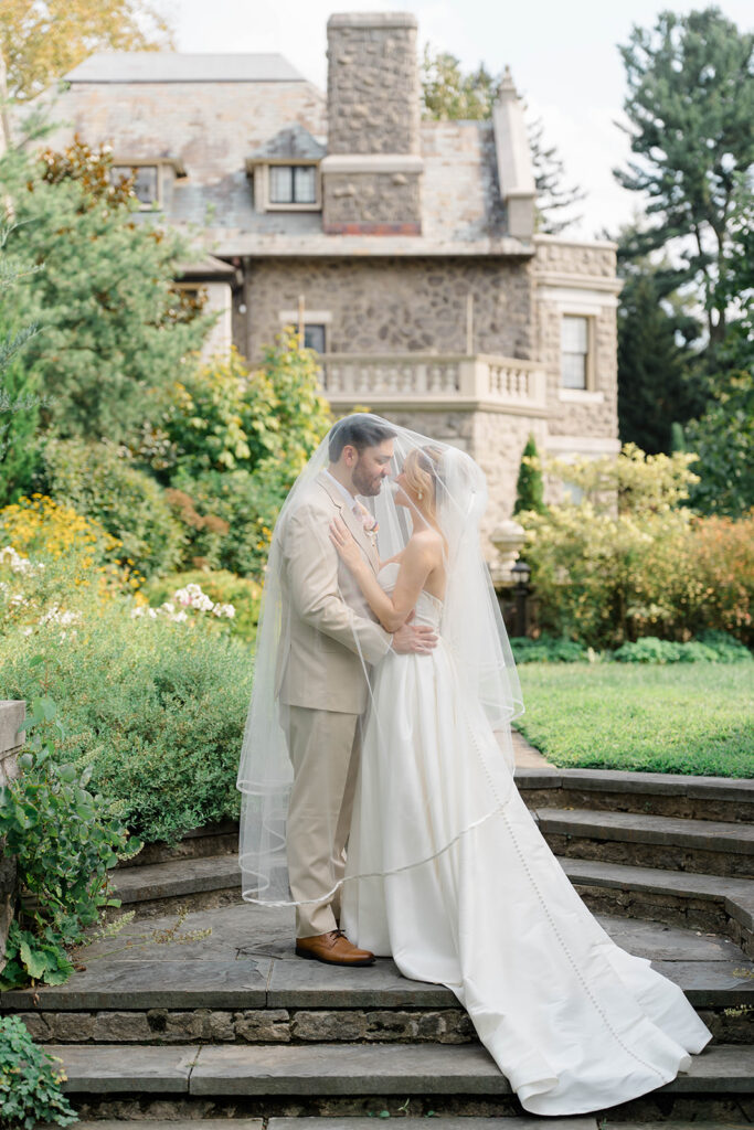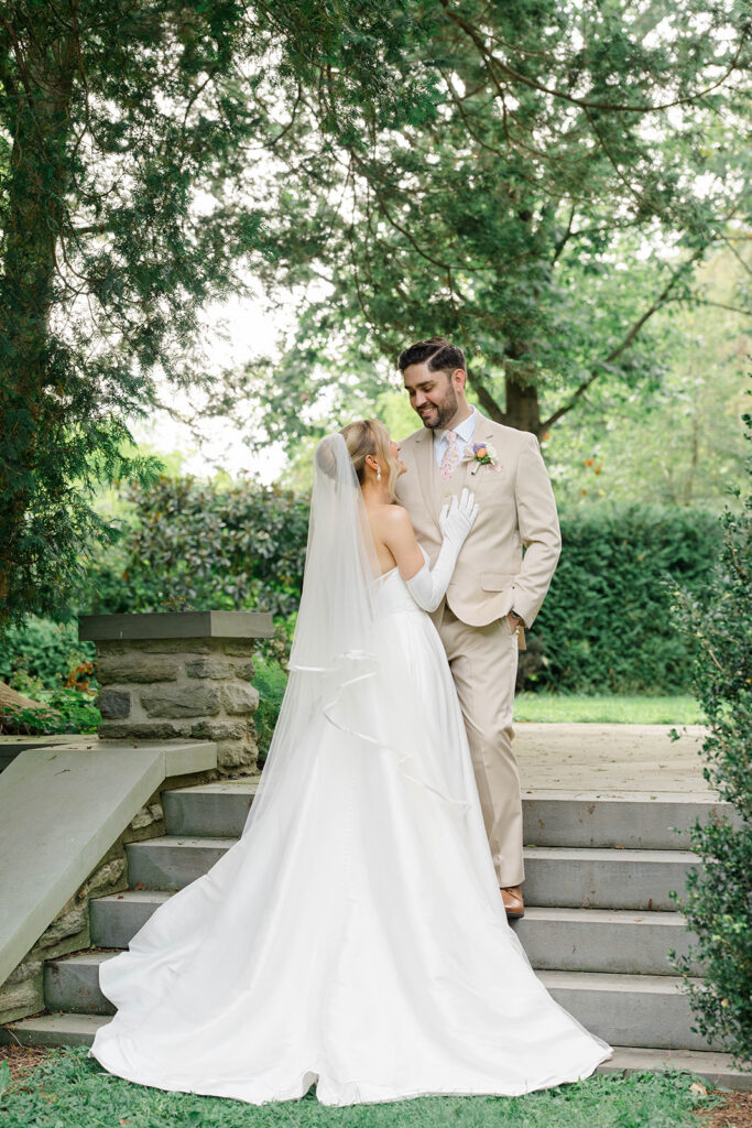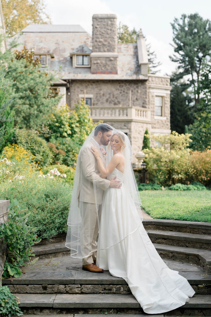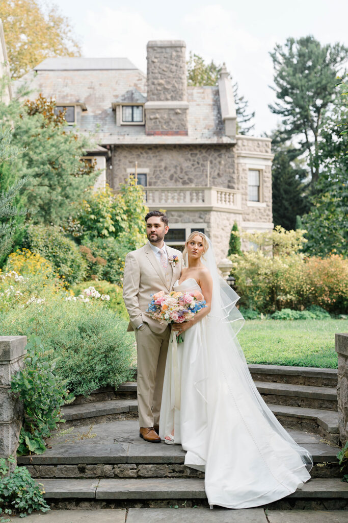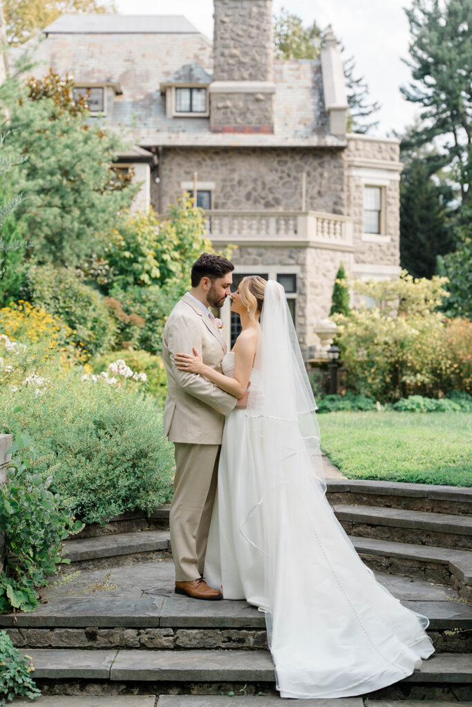 I love when couples choose to take portraits at a location that Isn’t usually used for a wedding day. Stoneleigh in Villanova is such a perfect location for photos. The stunning gardens and picture perfect landscape make it a dreamy location for photos. There are so many worthy spots to choose from, which makes it a versatile spot. The main house has a timeless elegance that perfectly enhances the beauty of the grounds surrounding it.