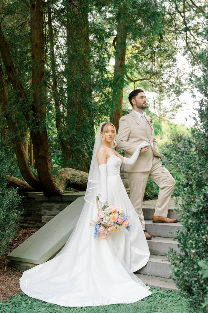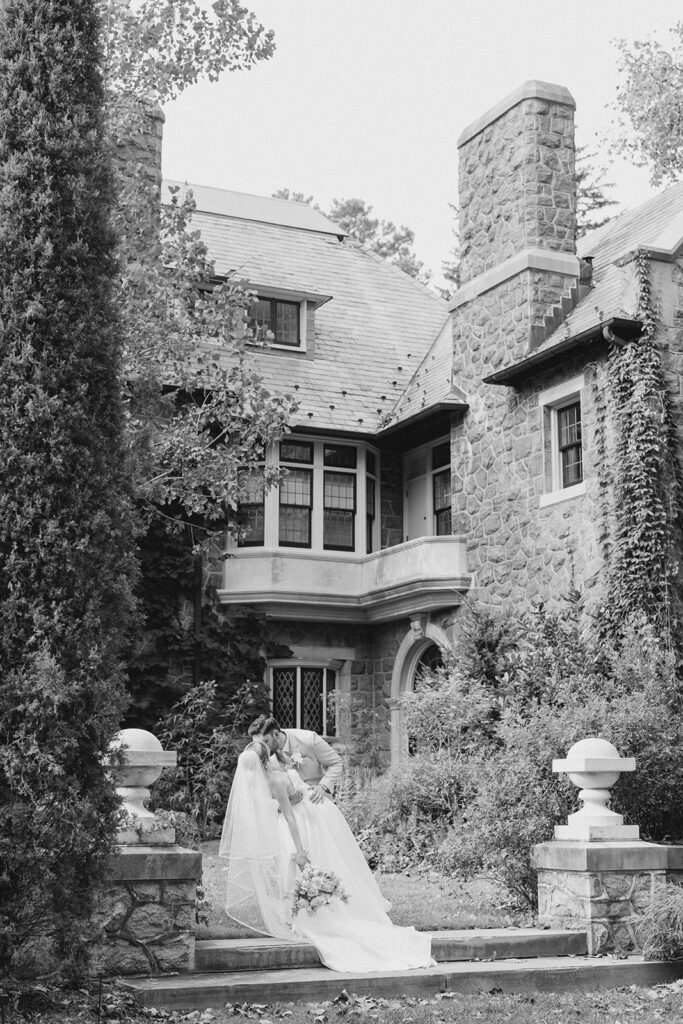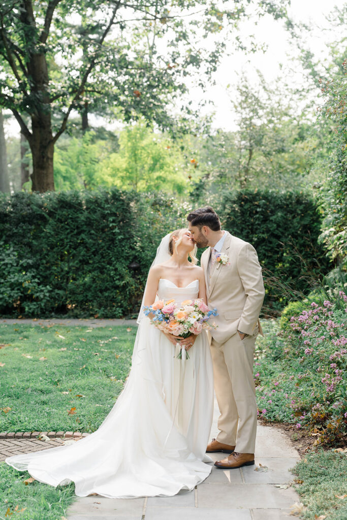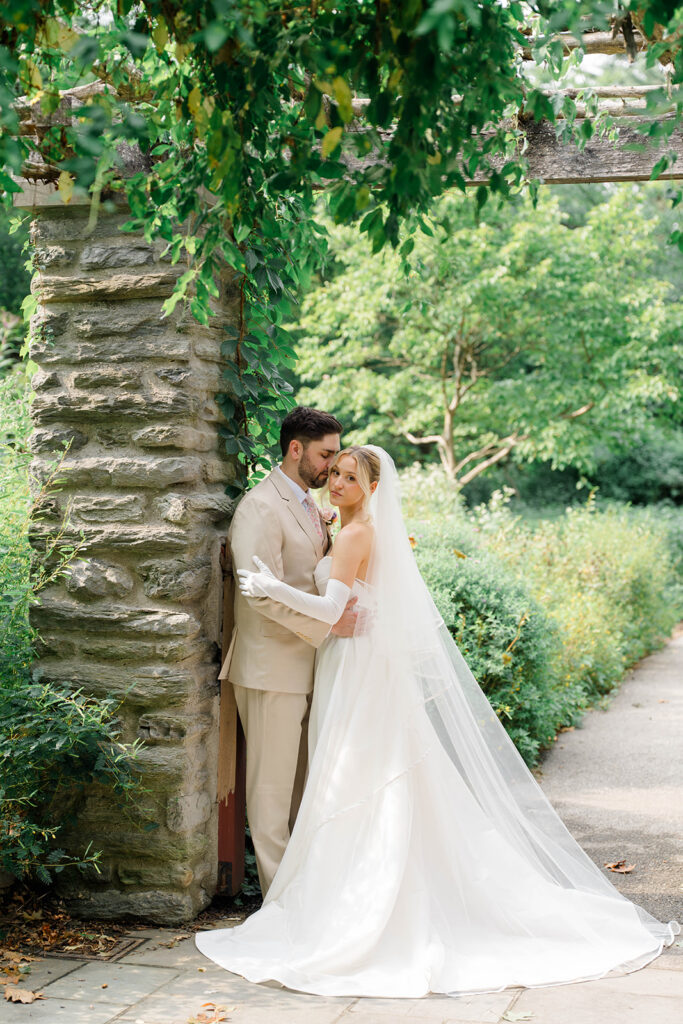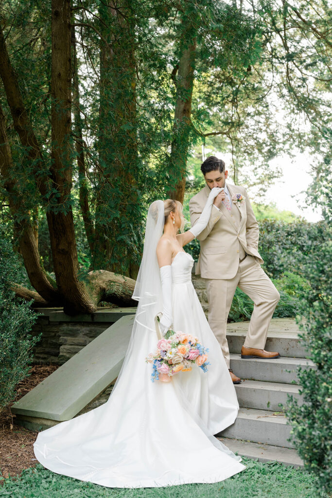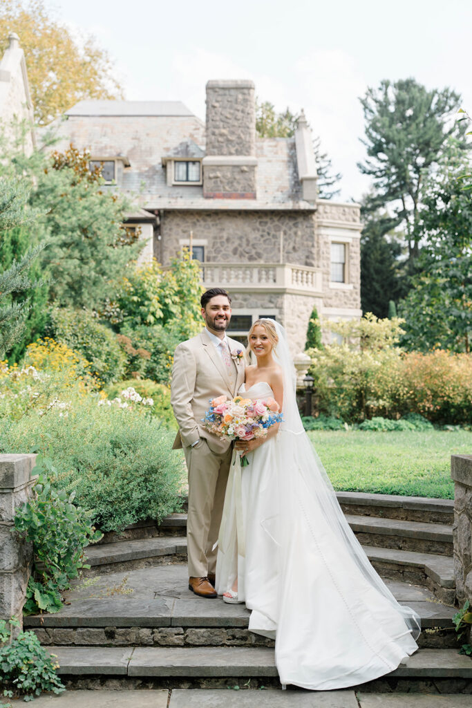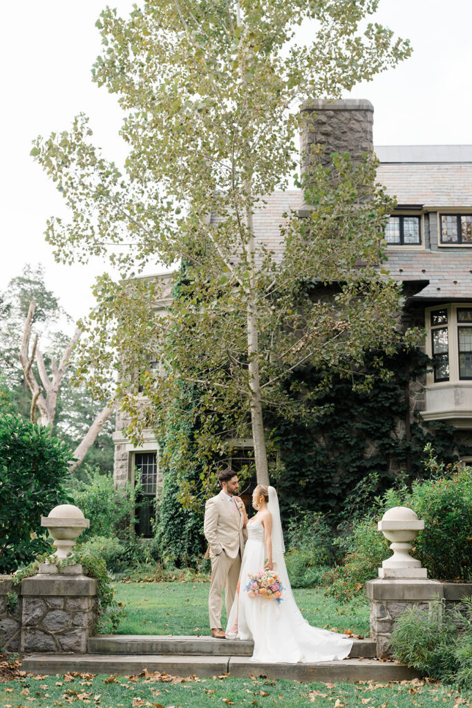 I love when couples choose to take portraits at a location that Isn’t usually used for a wedding day. Stoneleigh in Villanova is such a perfect location for photos. The stunning gardens and picture perfect landscape make it a dreamy location for photos. There are so many worthy spots to choose from, which makes it a versatile spot. The main house has a timeless elegance that perfectly enhances the beauty of the grounds surrounding it.