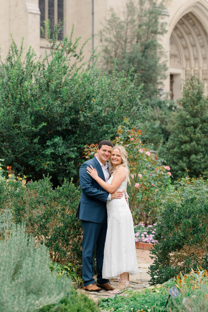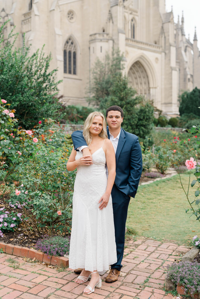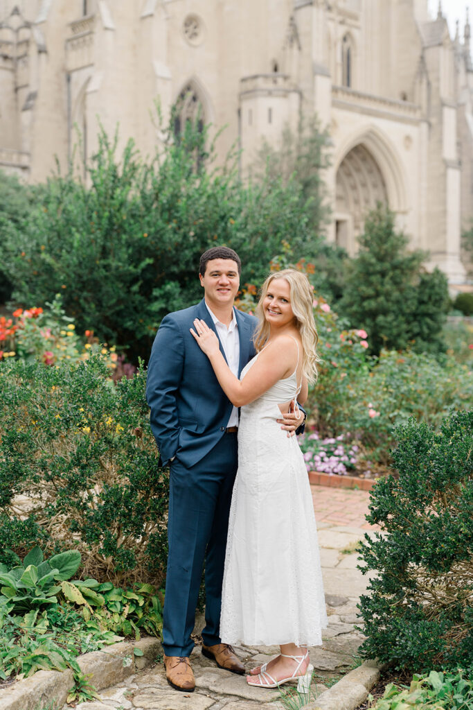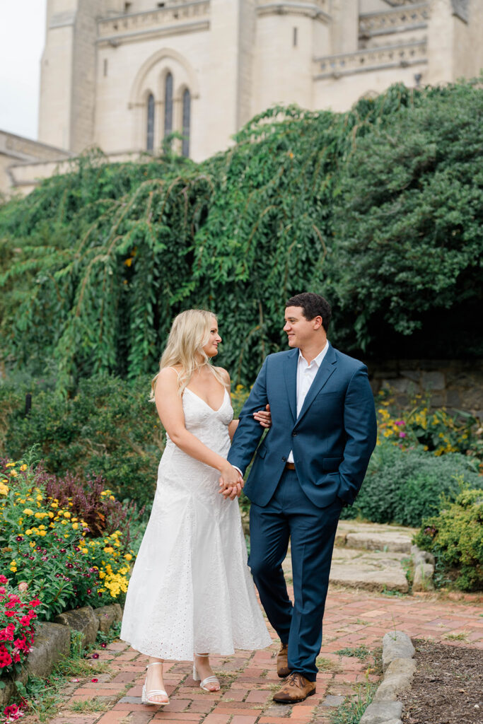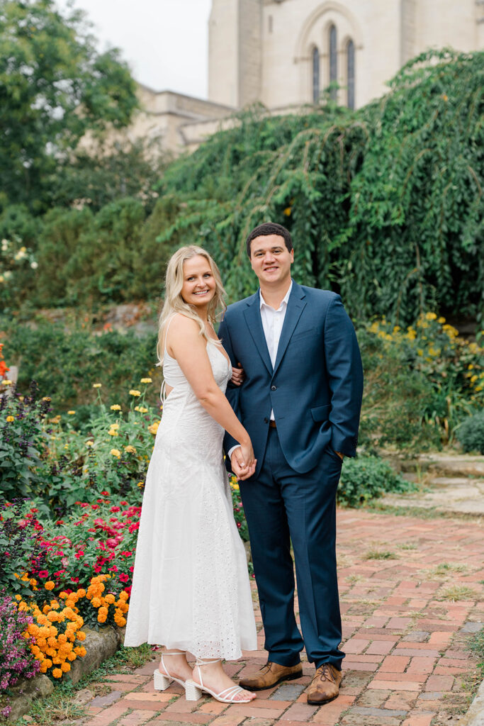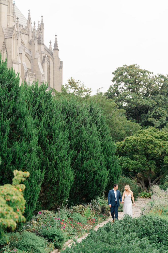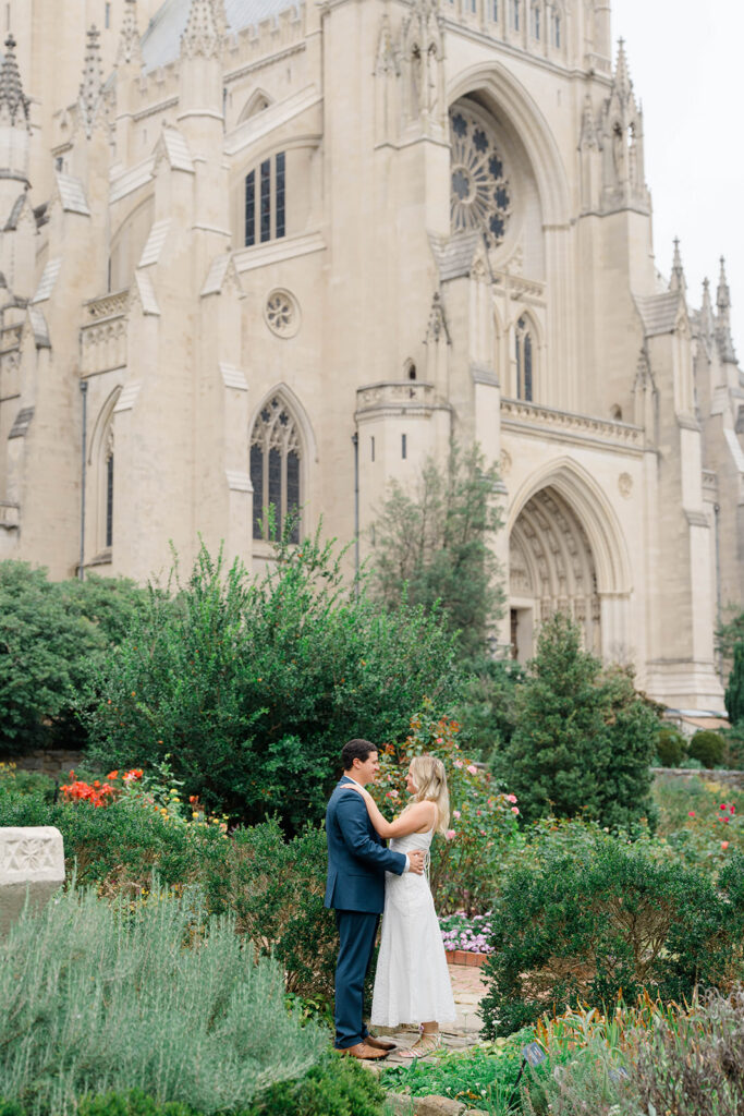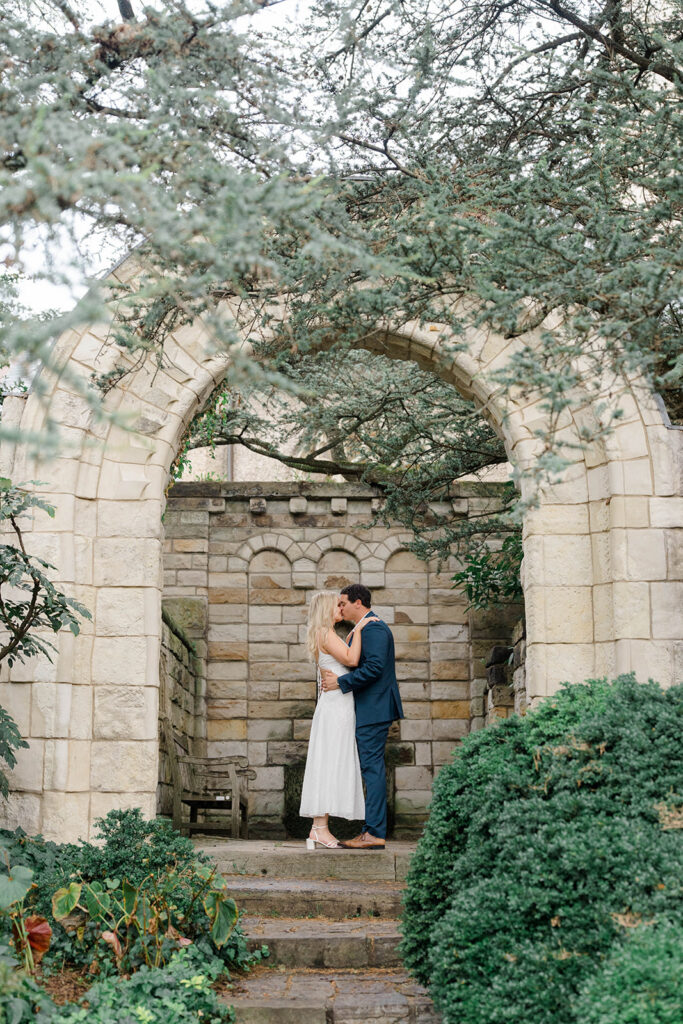 Bishop’s garden is one of those effortlessly romantic locations to take engagement photos. This beautiful garden nestled in DC is the kind of place that feels like it was made for quiet moments. It’s a perfect escape away from the hustle and bustle of the city. Tucked behind the Washington National Cathedral, the garden’s stone pathways, archways, and lush greenery gave us the perfect backdrop to capture this sweet session.